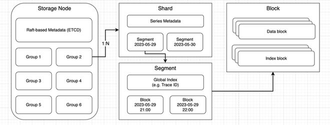对于高基数问题的解决和优化,BanyanDB 对于 Metrics 、Logging、Tracing 数据的存储,会选定 Tags 作为序列标志,可在 schema 阶段进行一个特定选择,而不会选择所有的 Tags 来做序列,从而有效地降低这部分存储。