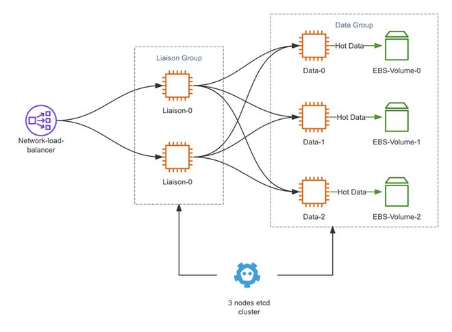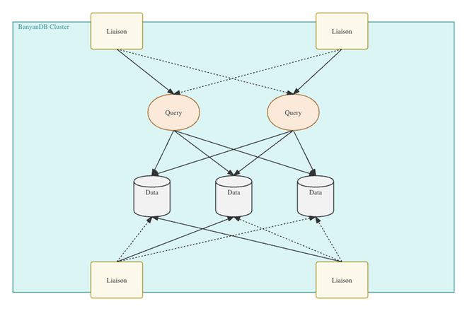 其分布式模式如下图。其中■★■■,Liaison 状态节点作为路由入口节点,会独立地计算出数据的拓扑情况,数据会被分散到特定的写入节点上◆■★■◆。其写入模式与查询模式存在非常大的区别◆★★,在写入阶段数据会被写入特定的分片,在查询时★■,查询执行器会访问所有节点■★◆◆,而不会去访问数据分片信息。这样的设计可以防止数据节点的故障时系统不可用。这也是 BanyanDB 数据库与其他数据库相比的独特之处。所以BanyanDB是一个面向高可用的数据库。