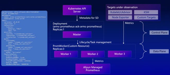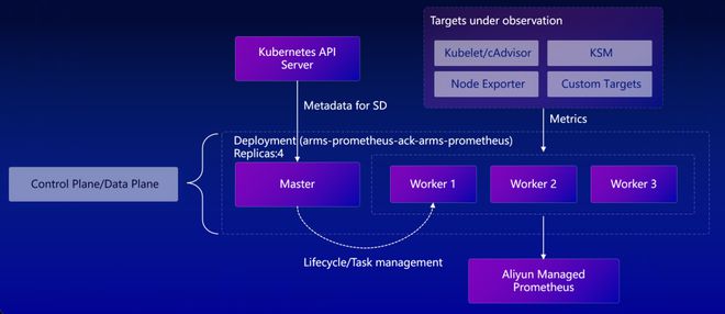 阿里云 ASI 超大规模集群采集配置合并上,Master 中进行采集配置的合并和服务发现◆◆■★★,并根据自定义的采集开关启停 Job,Worker 中过滤废弃指标。