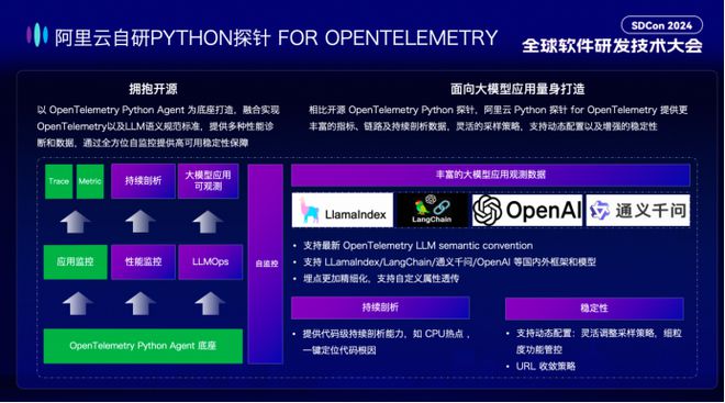 当前LLM应用的主流开发语言为 Python◆★,阿里云推出自研 Python Agent 以便更高质量的采集数据。相比开源实现■★■◆,阿里云 Python 探针提供更丰富的指标、链路及持续剖析数据■★,灵活的采样策略■◆,细粒度管控,支持动态配置,提供多种性能诊断和数据,通过全方位自监控提供高可用稳定性保障。同时面向大模型应用进行量身打造,支持最新 OpenTelemetry LLM semantic convention,支持 LLamaIndex / LangChain /通义千问/ OpenAI 等国内外框架和模型,实现埋点更加精细化■■★◆,同时支持自定义属性透传能力◆◆◆,以满足多样化监测需求。